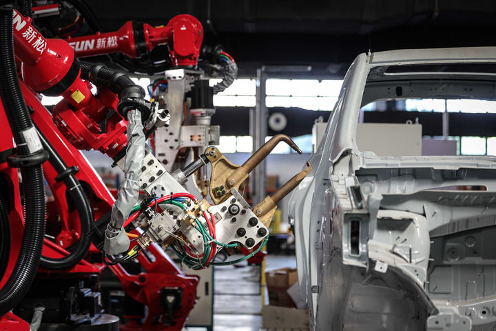 2024年6月3日拍攝的點焊機(jī)器人。機(jī)器人被廣泛應(yīng)用于工業(yè),它們能夠勝任繁重、危險或復(fù)雜的工作,提高生產(chǎn)效率和經(jīng)濟(jì)效益。新華社記者 潘昱龍 攝