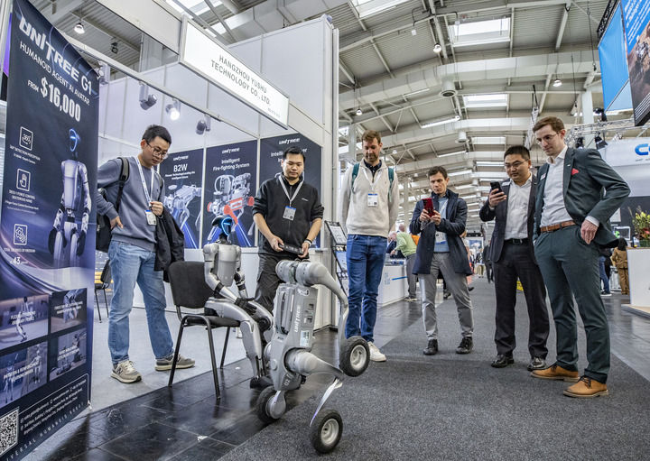 2025年4月1日,在德國(guó)漢諾威工業(yè)博覽會(huì)上,人們?cè)谟顦?shù)科技展區(qū)觀看機(jī)器狗演示。新華社記者 張帆 攝