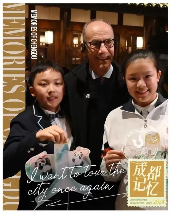 國際大體聯(lián)主席艾德收到的成都記憶定制文創(chuàng)風箏。圖為他與成都中小學生的合影。新華社發(fā)