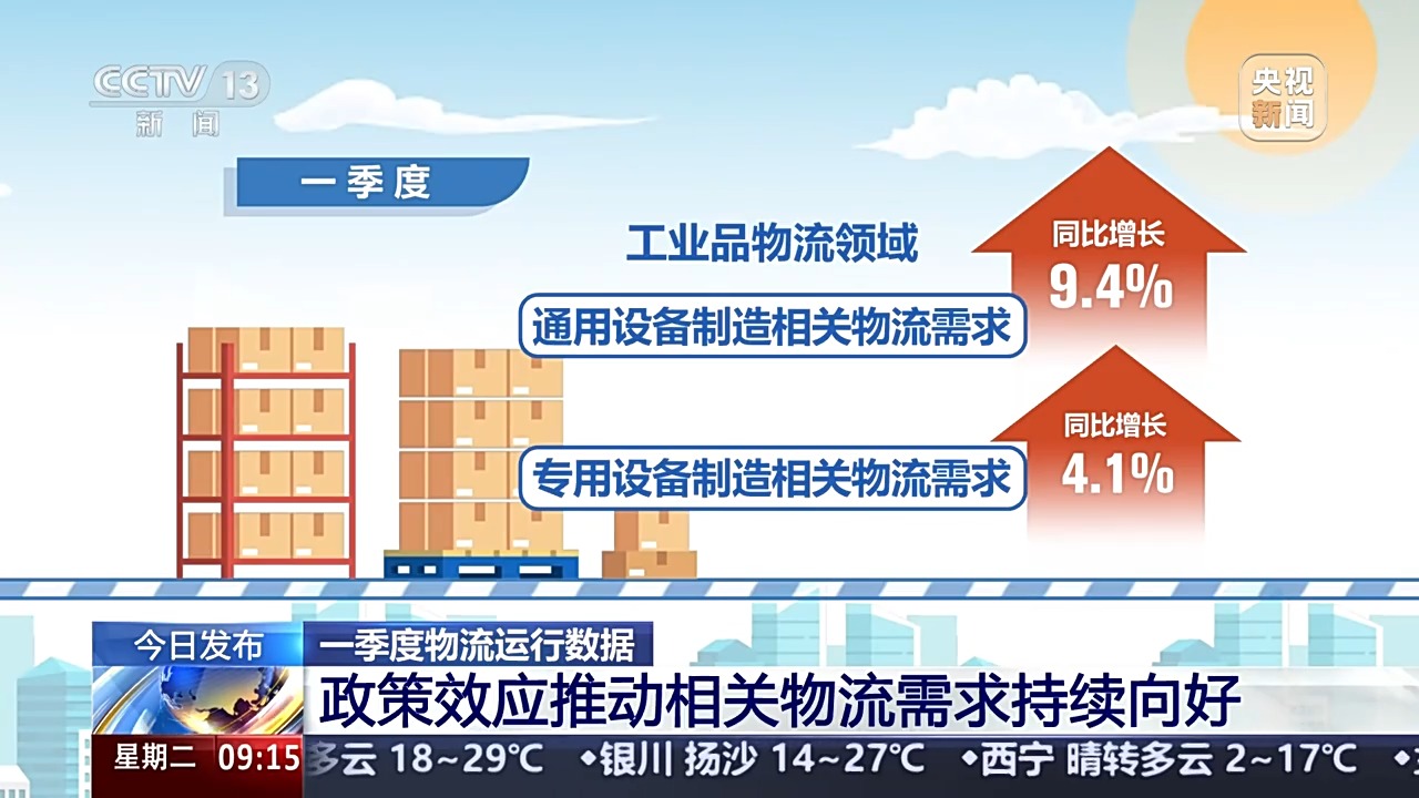 政策效應(yīng)持續(xù)顯現(xiàn),大規(guī)模設(shè)備更新、消費(fèi)品以舊換新政策推動相關(guān)物流需求持續(xù)向好。一季度,工業(yè)品物流領(lǐng)域的通用設(shè)備、專用設(shè)備制造相關(guān)物流需求,同比分別增長9.4%、4.1%;民生消費(fèi)領(lǐng)域的通信器材類、家用電器和音像器材類、家具類商品零售相關(guān)物流需求同比分別增長26.9%、19.3%和18.1%。