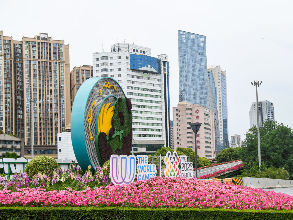 4月29日,在成都人民南路上拍攝的成都世運(yùn)會(huì)主題景觀。新華社記者 王曦 攝