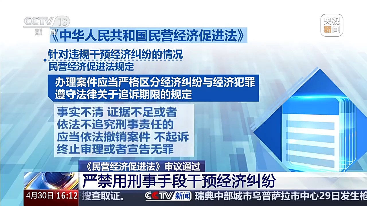 針對(duì)實(shí)踐中存在的違規(guī)干預(yù)經(jīng)濟(jì)糾紛、異地執(zhí)法等情況,民營(yíng)經(jīng)濟(jì)促進(jìn)法也作出了明確規(guī)定,嚴(yán)禁用刑事手段干預(yù)經(jīng)濟(jì)糾紛,加強(qiáng)異地執(zhí)法協(xié)作。