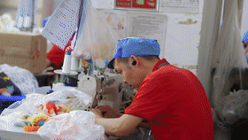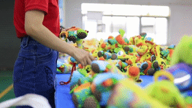車間另一頭,品檢組組長(zhǎng)梁建敏正給玩具成品審核把關(guān)。梁建敏很瘦,但很有能量,拖貨、倒貨、檢查貨,好像總有使不完的力氣,臉上總是掛著陽(yáng)光般的笑容,眼睛里充滿對(duì)工作的熱忱。她驗(yàn)貨時(shí)不單用眼睛,還會(huì)把毛絨玩具貼近耳朵來(lái)聽(tīng)。