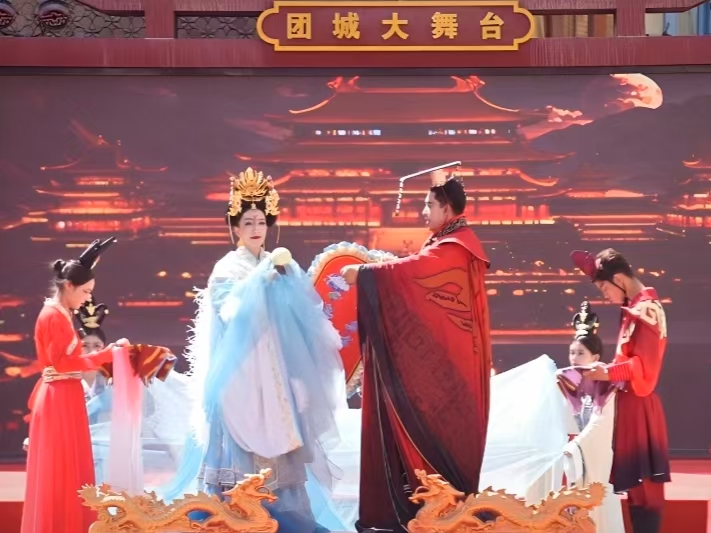 這是5月1日和田團(tuán)城開城儀式上沉浸式舞劇《西巡傳說(shuō)》的演出現(xiàn)場(chǎng)。