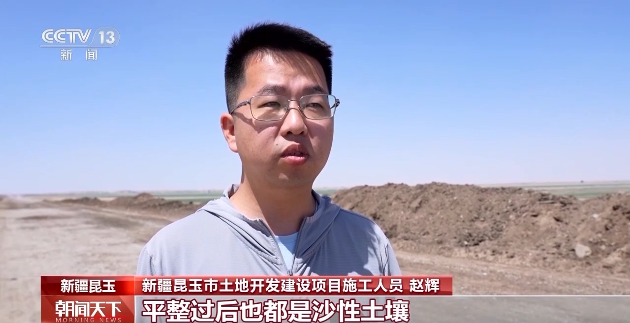新疆昆玉市土地開(kāi)發(fā)建設(shè)項(xiàng)目施工員 趙輝:這邊原本都是沙漠原始地貌,平整過(guò)后也都是沙性土壤,沙土的營(yíng)養(yǎng)貧瘠,肥力差,抓一把土,能從指縫里漏掉90%。通過(guò)羊糞和水溶肥的有效結(jié)合,施進(jìn)去之后,我們能把沙土的結(jié)構(gòu)團(tuán)?;?jiǎn)單來(lái)說(shuō)就是把一團(tuán)散沙變成緊密有孔隙的小團(tuán)體,這樣施進(jìn)去的水和營(yíng)養(yǎng)都能留存住。