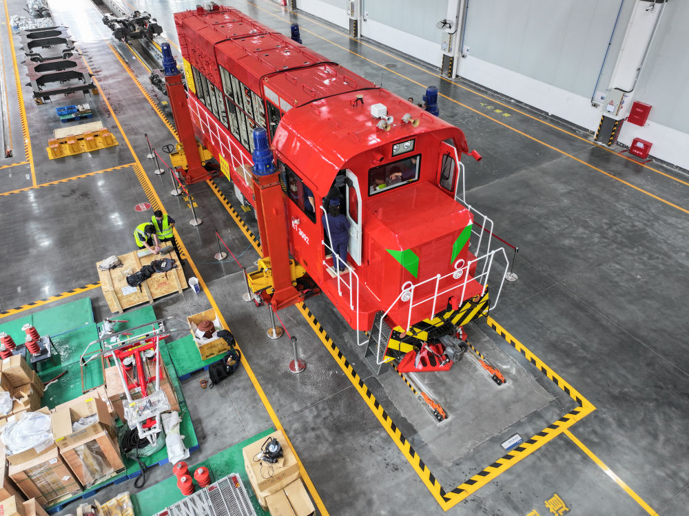 這是4月26日在湖南株洲聯(lián)誠(chéng)集團(tuán)控股股份有限公司新產(chǎn)業(yè)事業(yè)部車(chē)間拍攝的一臺(tái)準(zhǔn)備改造成新能源的機(jī)車(chē)(無(wú)人機(jī)照片)。新華社記者 陳澤國(guó) 攝