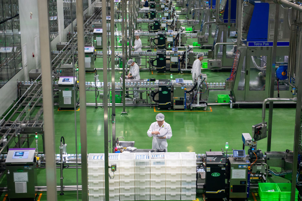 2025年4月17日,在內(nèi)蒙古呼和浩特市土默特左旗,工人在伊利現(xiàn)代智慧健康谷全球智能制造產(chǎn)業(yè)園灌裝車(chē)間內(nèi)工作。新華社發(fā)(李心逸攝)