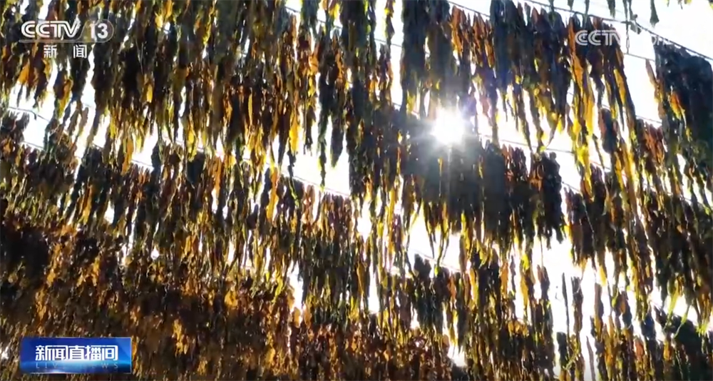 從空中俯瞰,成排鋼索從半山腰鋪架下來(lái),層層疊疊的海帶如綠色瀑布傾瀉。與傳統(tǒng)地面晾曬相比,這種立體掛曬的方式通風(fēng)性更好,能縮短晾曬周期,還能減少泥沙附著,保持海帶潔凈干爽,提升海帶品相。