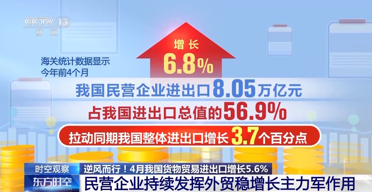 海關(guān)總署統(tǒng)計(jì)分析司司長(zhǎng) 呂大良:今年以來,各項(xiàng)促進(jìn)民營(yíng)經(jīng)濟(jì)發(fā)展的政策措施協(xié)同發(fā)力,參與外貿(mào)的民營(yíng)企業(yè)數(shù)量穩(wěn)定增加。前4個(gè)月,有進(jìn)出口實(shí)績(jī)的民營(yíng)企業(yè)達(dá)49.2萬家,增加8.2%,占我國(guó)有進(jìn)出口實(shí)際企業(yè)數(shù)量的86.5%。