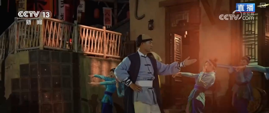 實際上,這處街道只是整場演出中的一幕。游客隨演員一路向前,長達1個小時的劇情講述了百年前一名外國導(dǎo)演來到鄭州,尋找太極的故事。其間,會串聯(lián)起景區(qū)的不同場景,比如走過繁華的“老鄭州”街道,后面就變成了一個古樸的村落。置景取材于太極拳發(fā)源地之一的河南焦作陳家溝,村里既有講述拜師學(xué)藝故事的情景劇,又有以太極功夫編排的舞蹈表演,體現(xiàn)出中原地區(qū)的多樣歷史文化。