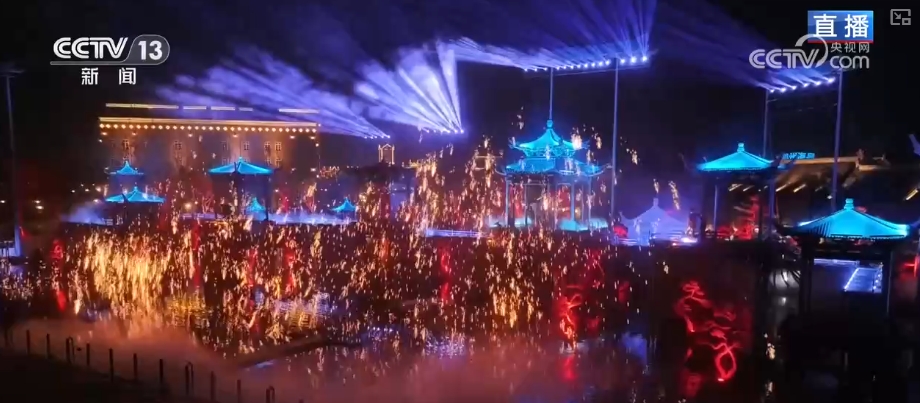 除了沉浸式演出,景區(qū)也在上新其他精彩節(jié)目。比如非遺打鐵花表演,比較常見的表演場景是在地面或者城樓之上。然而在這里,鐵花秀的表演場地選在了水面上的一處處亭臺樓閣中,火光四射,與樓閣呼應(yīng),映照出濃濃的中式美學(xué)。