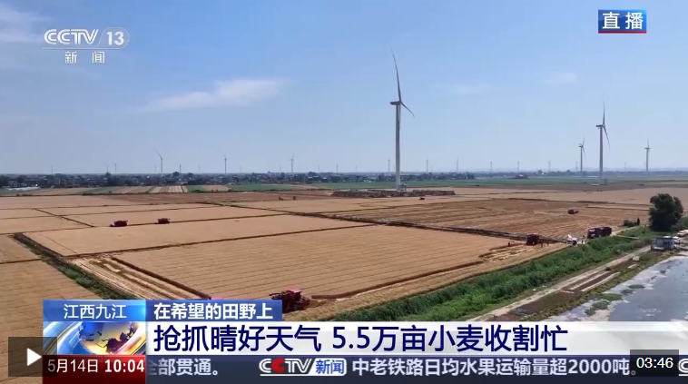 位于江西省九江市柴桑區(qū)的江洲鎮(zhèn)今年種植小麥5.5萬(wàn)畝,占九江市小麥種植面積的三分之一。眼下那里的小麥已經(jīng)成熟,為了搶抓晴好天氣,當(dāng)?shù)胤e極組織機(jī)械收割。