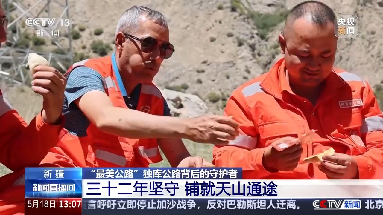下午兩點(diǎn)多,亞克甫招呼大家停下來吃午飯。這幾天,亞克甫和同事們要搶在獨(dú)庫公路通車之前,把冰封了一個(gè)冬天的道路養(yǎng)護(hù)好。他們經(jīng)常沒時(shí)間回到養(yǎng)護(hù)站休整,午飯也只能在路邊對(duì)付一下。