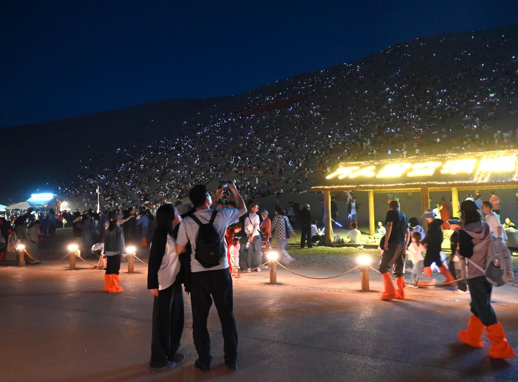 5月1日晚,游客在甘肅省敦煌市鳴沙山月牙泉景區(qū)參加萬(wàn)人星空演唱會(huì)。新華社發(fā)(張曉亮攝)
