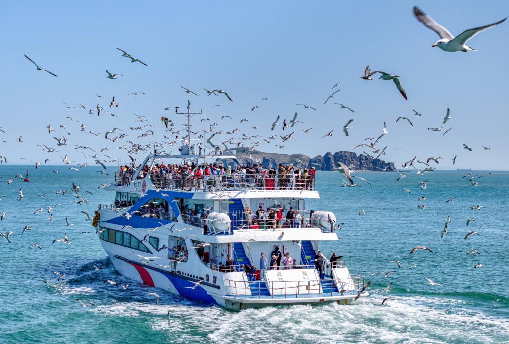 5月4日,在山東省榮成市海驢島海域,游客乘坐海驢島環(huán)島游專線與黑尾鷗互動(無人機照片)。新華社發(fā)(李信君 攝)