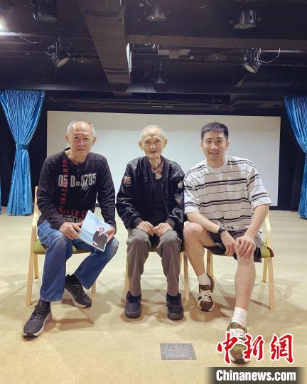 2023年5月8日,紀(jì)錄片《日暮·歸鄉(xiāng)》導(dǎo)演楊正濃與臺灣老兵金英次子金士杰(左一)、“感動中國”人物高秉涵(中)在臺北交流。(片方供圖)
