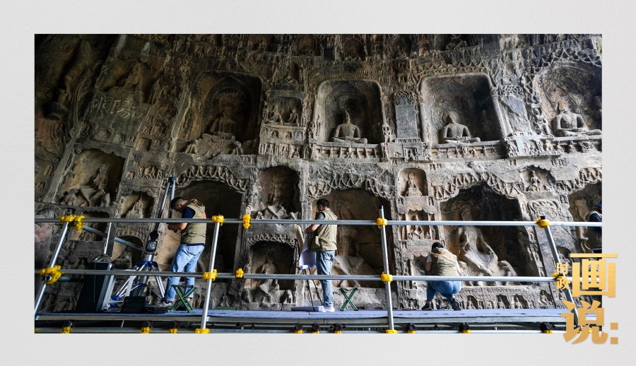 龍門石窟研究院工作人員在古陽洞使用關(guān)節(jié)臂掃描儀對佛像進(jìn)行數(shù)字化掃描
