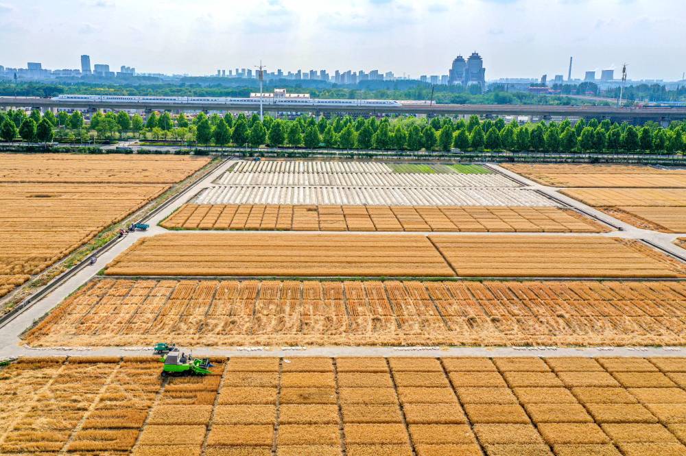 5月20日,在江蘇里下河地區(qū)農(nóng)科所(揚州市農(nóng)科院)試驗田,農(nóng)民駕駛收割機(jī)收割小麥(無人機(jī)照片)。新華社發(fā)(任飛攝)