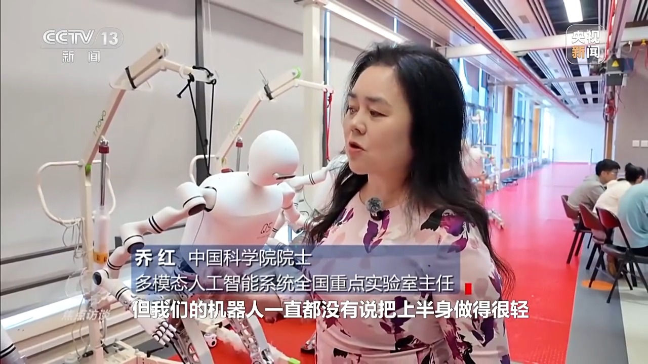 中國(guó)科學(xué)院院士、多模態(tài)人工智能系統(tǒng)全國(guó)重點(diǎn)實(shí)驗(yàn)室主任 喬紅:人形機(jī)器人都是自由度(關(guān)節(jié))比較多,但我們的機(jī)器人一直都沒(méi)有把上半身做得很輕,因?yàn)樗且鳂I(yè)的、干活的,所以沒(méi)有專門追逐要跑得快,跑得快也是我們的期望,現(xiàn)在也能跑2.2米每秒。