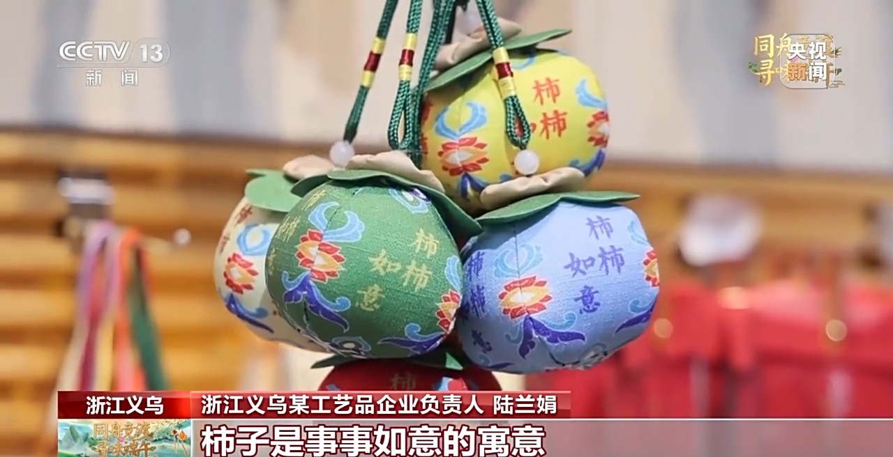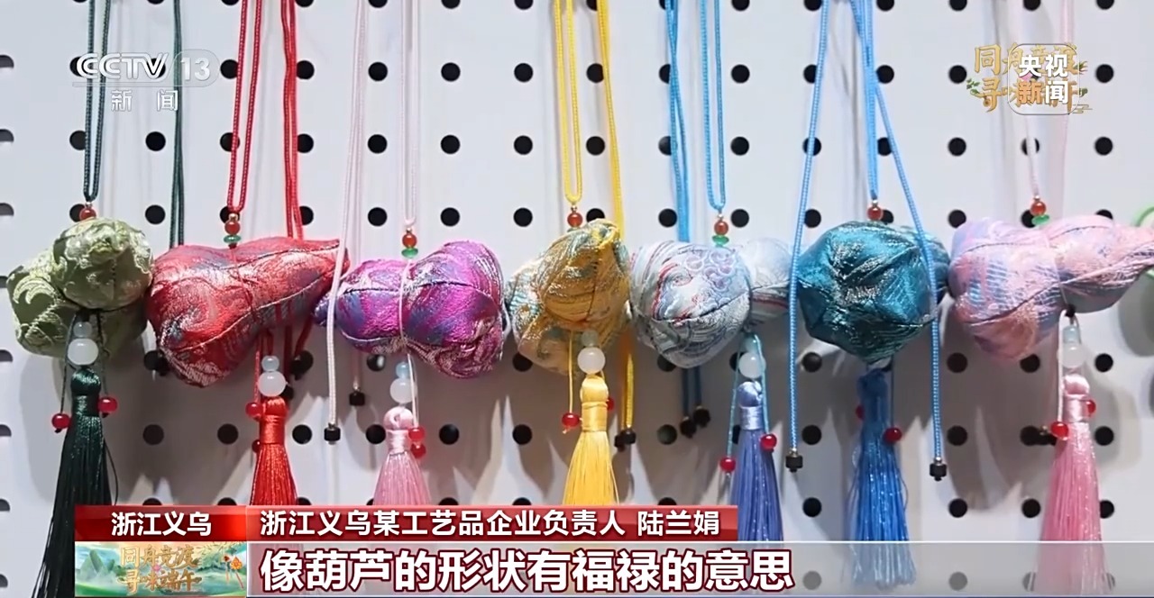 義烏某工藝品企業(yè)負責(zé)人 陸蘭娟:今年,在香囊的外觀設(shè)計上面,我們結(jié)合了中國傳統(tǒng)節(jié)日祝福的元素,設(shè)計了立體葫蘆、柿子等款式。像葫蘆的形狀有福祿的意思;柿子有事事如意的寓意,都是今年的“爆款”。