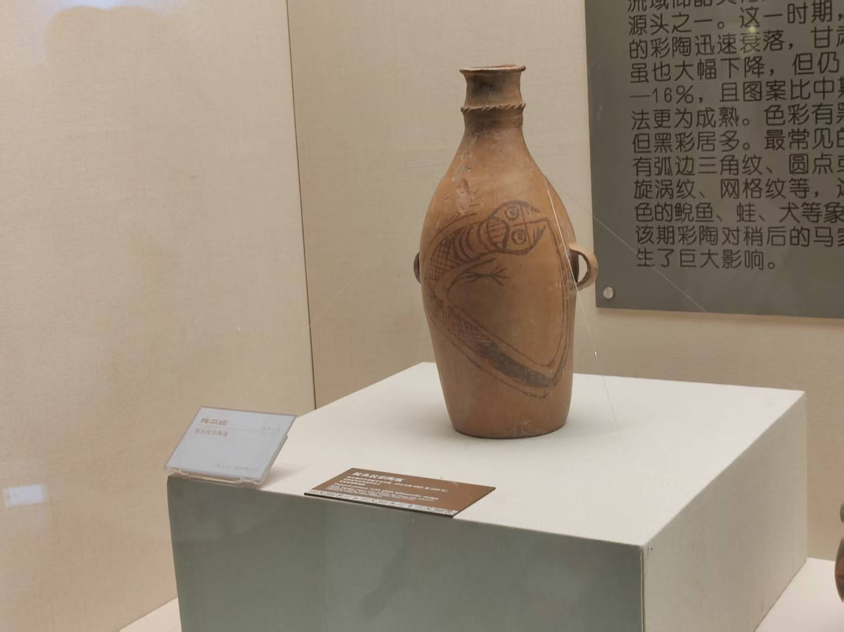 在“彩陶之鄉(xiāng)”主題展區(qū),仰韶文化鯢魚紋彩陶瓶成為焦點(diǎn)。這件距今5500年的陶瓶,腹部繪有人面鯢魚紋,被認(rèn)為是早期“龍圖騰”的雛形?!八赡苁欠诵蜗蟮某橄蟊磉_(dá),印證了甘肅作為中華文明重要發(fā)源地之一?!敝v解員介紹。作為甘肅唯一一件彩陶類國(guó)寶,其神秘圖案引發(fā)了采訪團(tuán)對(duì)史前先民精神世界的無(wú)限遐想。