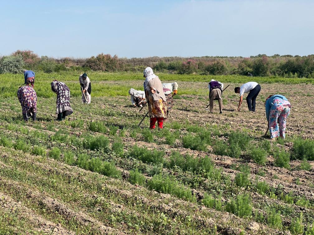 6月3日,位于烏茲別克斯坦穆伊納克鎮(zhèn)的咸海國(guó)際創(chuàng)新中心的試驗(yàn)示范園區(qū)內(nèi),當(dāng)?shù)剞r(nóng)戶在與中國(guó)科學(xué)院新疆生態(tài)與地理研究所合作共建的“光伏+生態(tài)”鹽生植物園里勞作。(受訪者供圖)