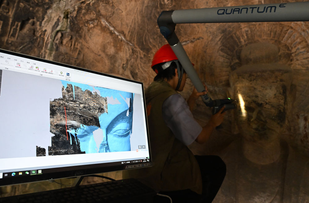 4月9日,武漢大學(xué)文化遺產(chǎn)智能計算實驗室團(tuán)隊成員在龍門石窟魏字洞使用關(guān)節(jié)臂掃描儀對佛像進(jìn)行數(shù)字化掃描。新華社記者 李嘉南 攝