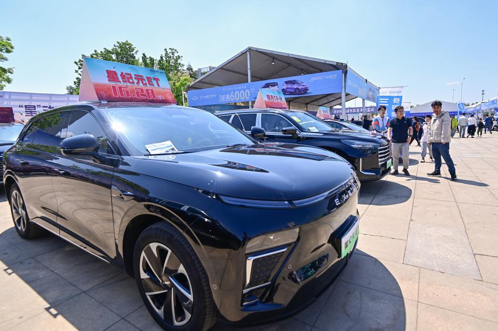 5月3日,消費(fèi)者在山東省青州市舉辦的汽車(chē)·房產(chǎn)家居文化節(jié)上參觀選購(gòu)展出的汽車(chē)。新華社發(fā)(王繼林?jǐn)z)