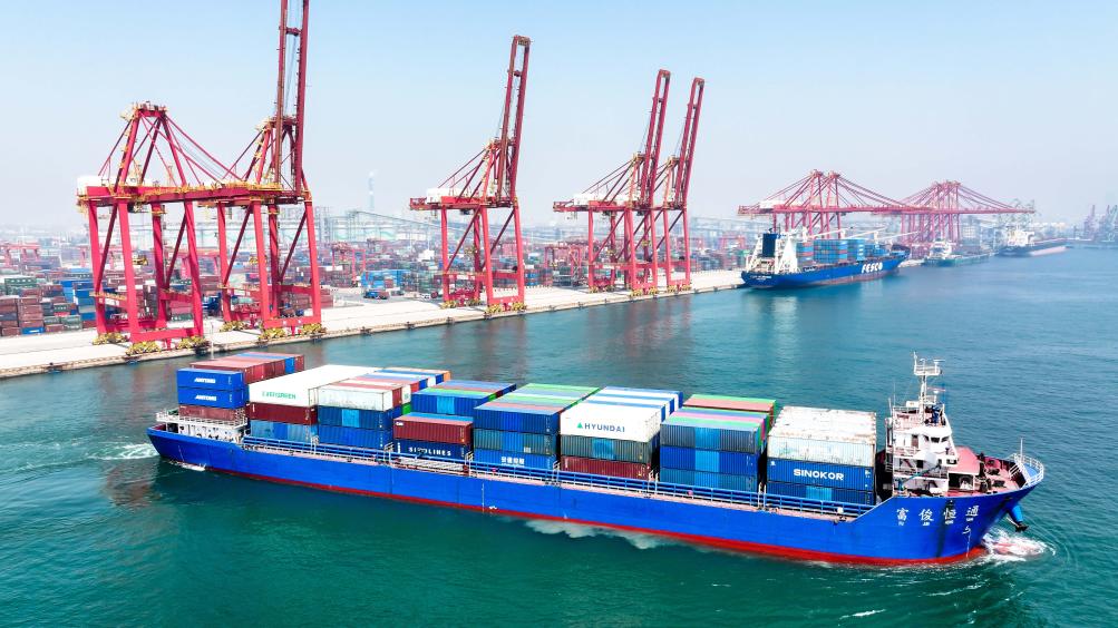 5月20日,在山東港口日照港集裝箱碼頭,滿(mǎn)載集裝箱的船舶駛離港口。新華社記者 郭緒雷 攝
