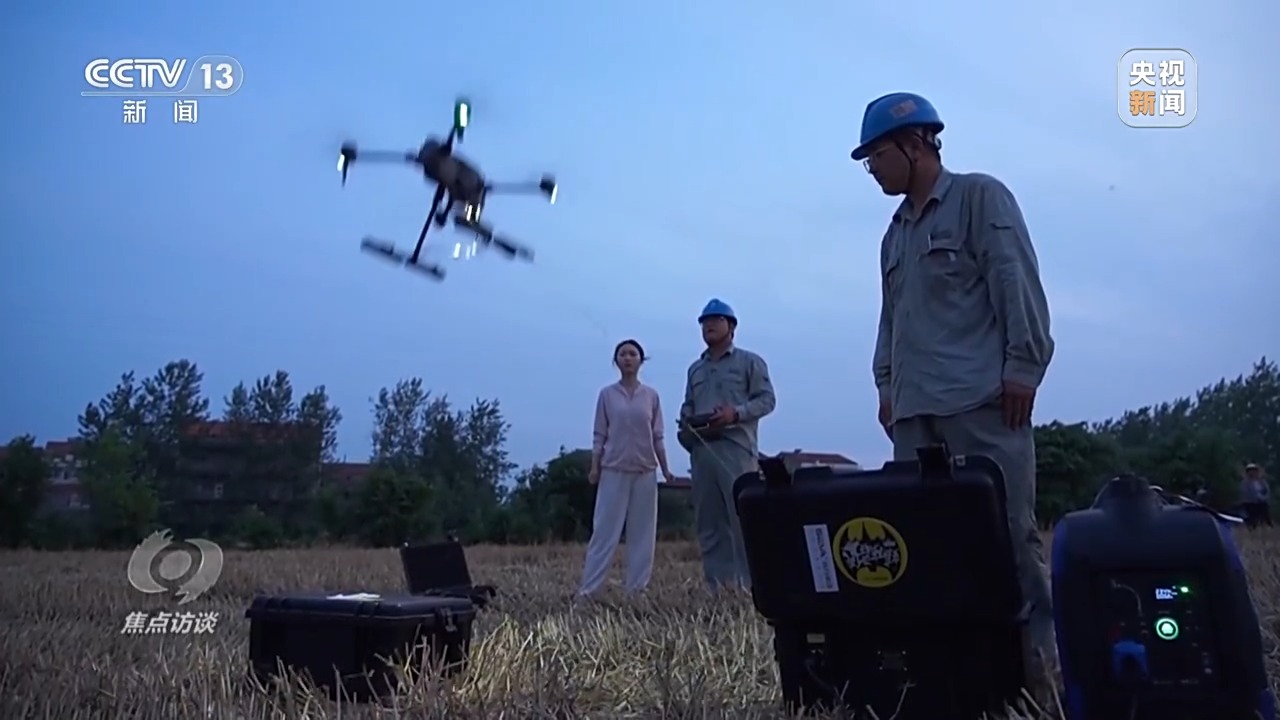 像放風(fēng)箏一樣,一個人從供電機(jī)牽線,另一個人控制無人機(jī)飛行,兩人打好配合,燈隨著車走。經(jīng)過五次磨合試飛,600瓦的燈光終于刺破夜空,照亮了兩畝麥田的區(qū)域。供電所技術(shù)人員的駐守,讓吳從先家的小麥在暴雨來臨前全部入倉。