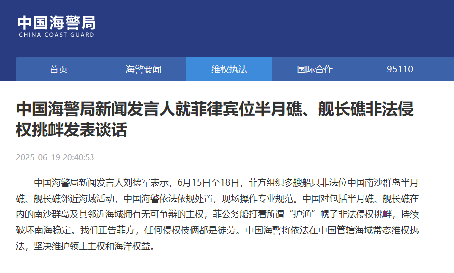 中國海警局新聞發(fā)言人劉德軍表示,6月15日至18日,菲方組織多艘船只非法位中國南沙群島半月礁、艦長礁鄰近海域活動,中國海警依法依規(guī)處置,現(xiàn)場操作專業(yè)規(guī)范。中國對包括半月礁、艦長礁在內(nèi)的南沙群島及其鄰近海域擁有無可爭辯的主權,菲公務船打著所謂“護漁”幌子非法侵權挑釁,持續(xù)破壞南海穩(wěn)定。我們正告菲方,任何侵權伎倆都是徒勞。中國海警將依法在中國管轄海域常態(tài)維權執(zhí)法,堅決維護領土主權和海洋權益。