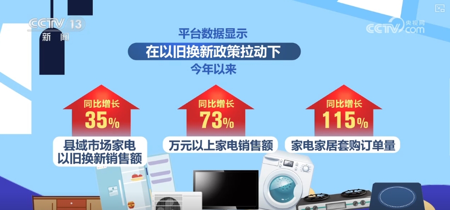 平臺數據顯示,在“以舊換新”政策拉動下,2025年以來,縣域市場家電“以舊換新”銷售額同比增長35%,萬元以上家電銷售額同比增長73%,家電家居套購訂單量同比增長115%。