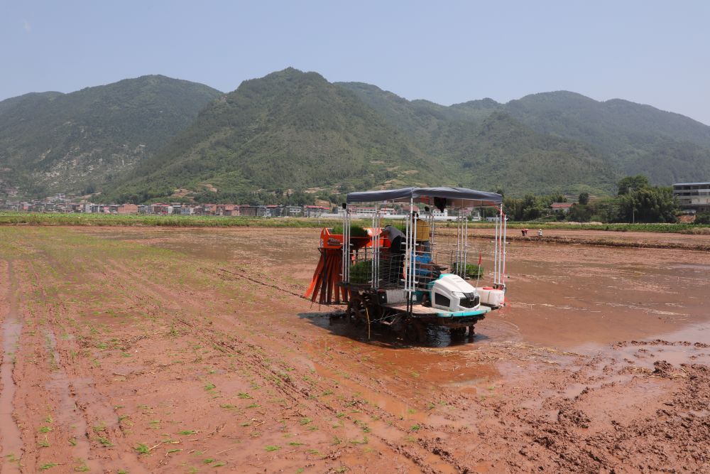6月13日,在湖南省湘西土家族苗族自治州龍山縣召市鎮(zhèn)前衛(wèi)村,農(nóng)機手駕駛插秧機進行插秧。新華社發(fā)(曾祥輝 攝)