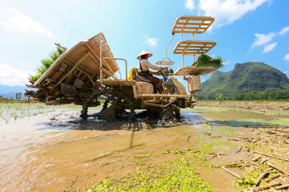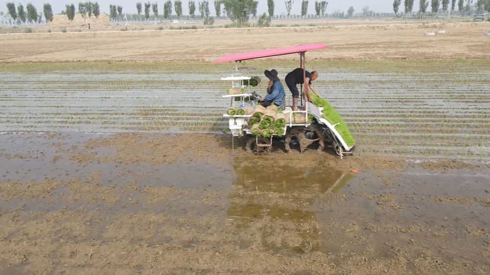 在河南省新鄉(xiāng)市原陽縣太平鎮(zhèn),種植戶們在插秧機的助力下,搶抓農(nóng)時,進行水稻插秧。受訪者供圖