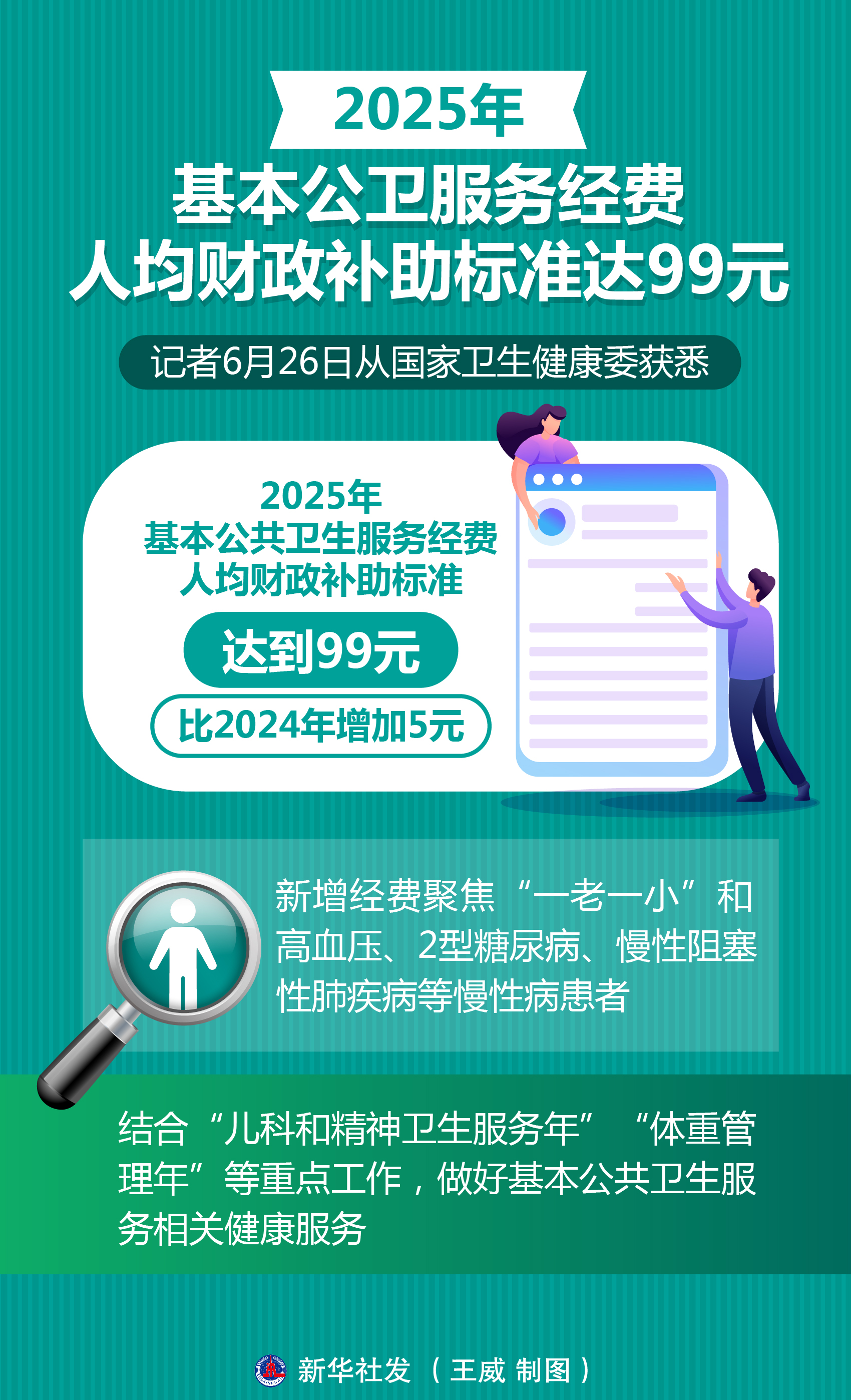 記者26日從國家衛(wèi)生健康委獲悉,2025年基本公共衛(wèi)生服務(wù)經(jīng)費(fèi)人均財政補(bǔ)助標(biāo)準(zhǔn)達(dá)到99元,比上年增加5元。