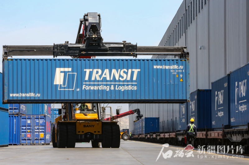 6月24日,阿拉山口站中歐(中亞)班列換裝區(qū)龍門吊往來穿梭,吊裝貨物。蔡增樂 攝