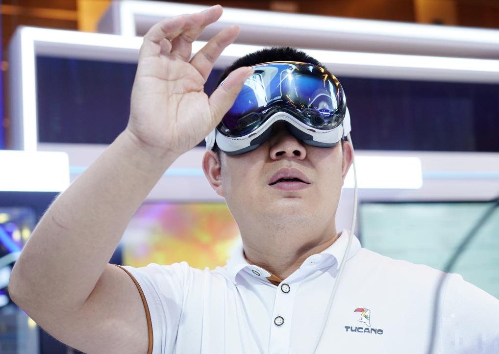 7月2日,參觀者在2025全球數字經濟大會數字經濟國際交流合作體驗區(qū)體驗一款MR混合現實設備。新華社記者 張晨霖 攝