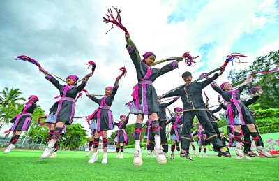 海南五指山市紅星學(xué)校學(xué)生在練習(xí)苗族盤皇舞。新華社發(fā)