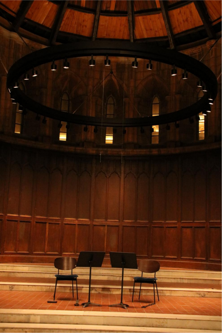 第二天晚上,我又來到安里甘藝術(shù)中心,觀看天津音樂學院師生演奏的“仲夏弦音:大提琴的沉吟與重奏”音樂會。坐在安里甘主堂倒沙漏形的穹頂下,沐浴在大提琴深情莊嚴的奏鳴中,我沉醉了。