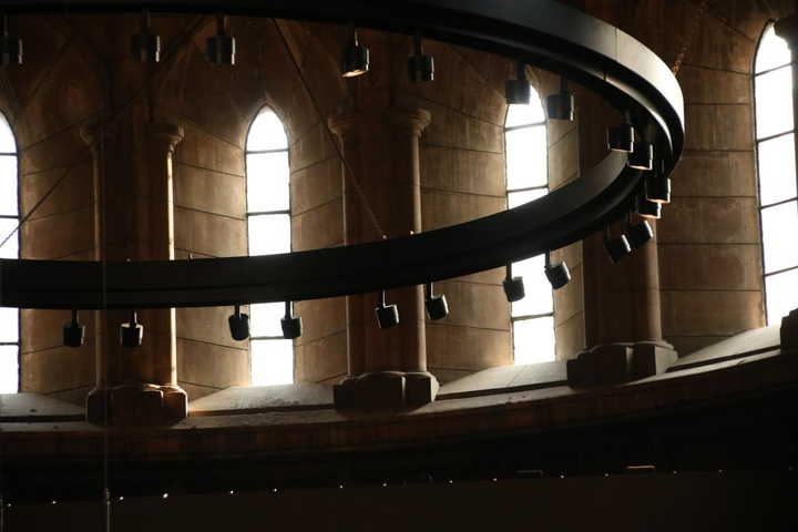 在原來祭臺的中間,現(xiàn)在改造為演講、演奏的環(huán)形中心臺。上方是一個中央環(huán)形燈,在沒亮燈之前就像一條烏黑色的緞帶,神秘且漂亮。