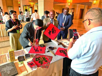 與會(huì)外國(guó)嘉賓在會(huì)議間隙體驗(yàn)寫福字。光明日?qǐng)?bào)記者 楊逸夫攝/光明圖片