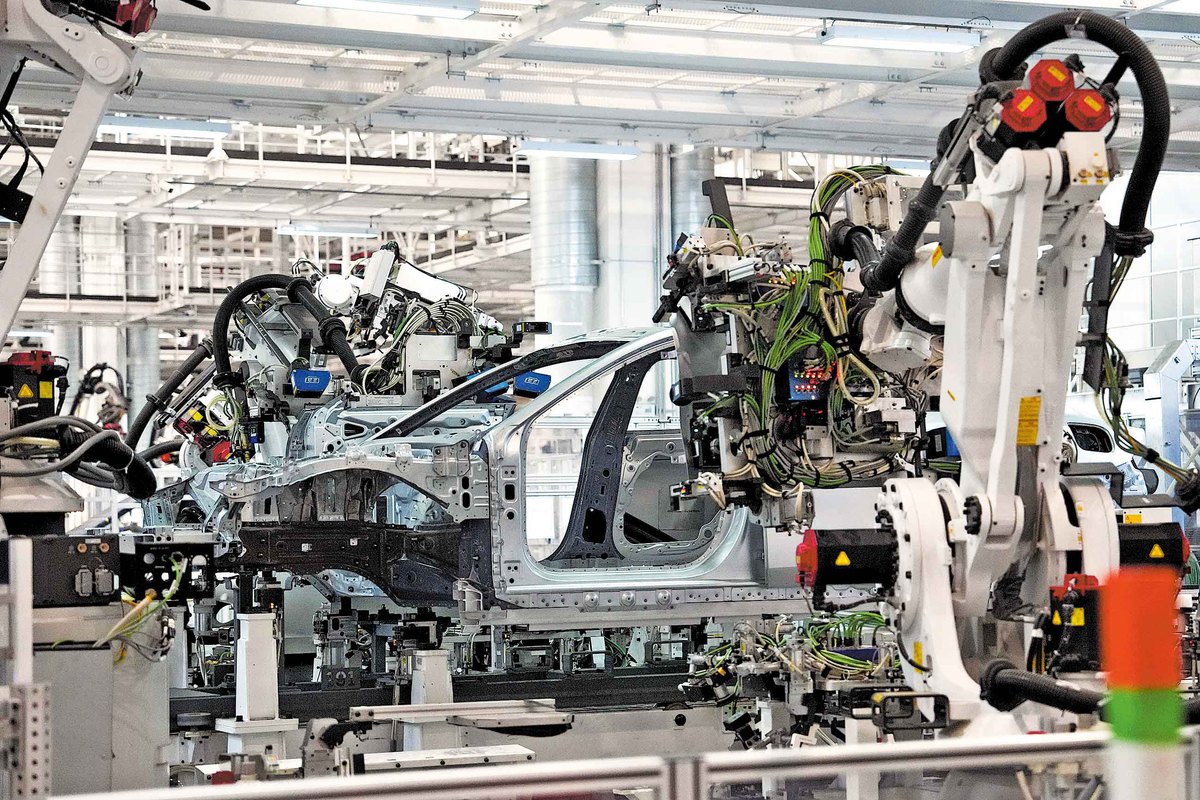 一輛汽車正在北京一條自動化生產(chǎn)線上進(jìn)行組裝。圖片來源:新華社