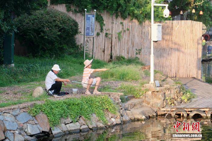 7月19日,江西省南昌市八一公園內(nèi),釣魚(yú)愛(ài)好者持小魚(yú)竿悠哉垂釣。朱瑩 攝