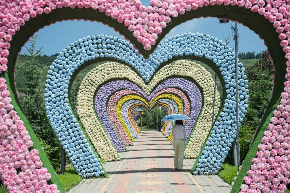7月22日,在青海省大通縣邊麻溝花海景區(qū),一名游客經過鮮花長廊。新華社記者 孫瑞博 攝