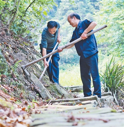 每次上山修路,陳興海和弟弟陳興合都會(huì)帶上鐵鍬、鎬頭、鋤頭、斧頭?!笆^硬得很,我一鎬頭下去,手震得疼!”這樣的日子,兄弟倆一過就是8年。總長(zhǎng)約15公里的古道,已經(jīng)修好了約2/3?!拔覀冞€要繼續(xù)往下修?!标惻d海說(shuō)。