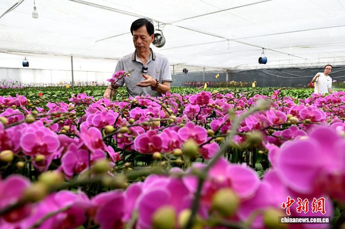 7月16日,臺(tái)胞王耀宗在位于福建漳州市南靖縣的天農(nóng)蘭花園里查看蝴蝶蘭長勢(shì)。 中新網(wǎng)記者 呂明 攝