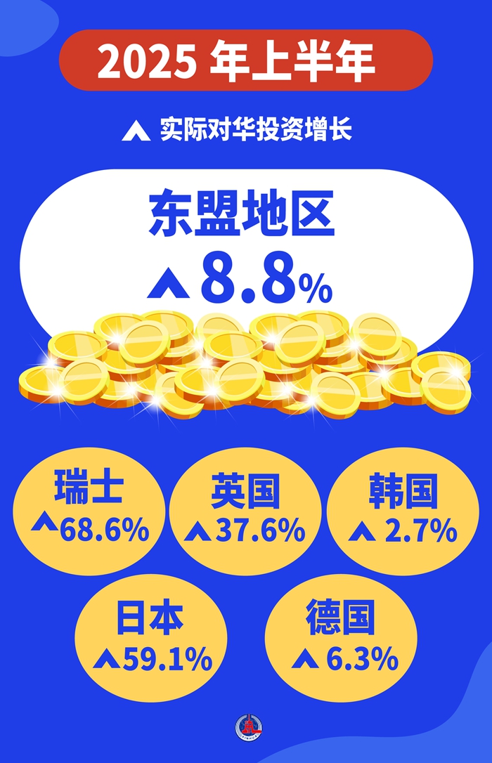 開放合作是歷史潮流,互利共贏是人心所向。今年上半年,東盟地區(qū)實際對華投資增長8.8%,瑞士、日本、英國、德國、韓國實際對華投資分別增長68.6%、59.1%、37.6%、6.3%、2.7%。