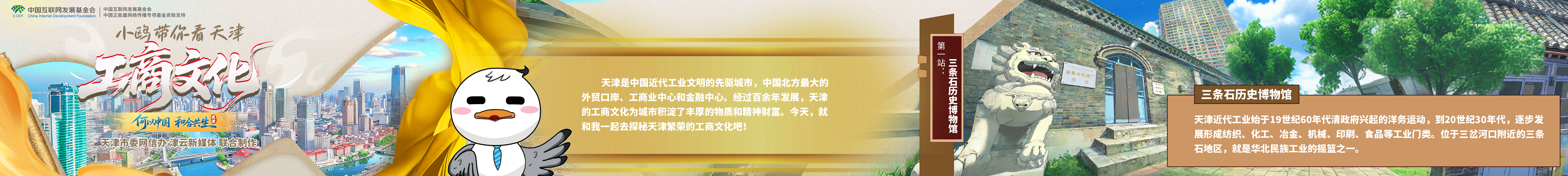 天津是中國近代工業(yè)文明的先驅(qū)城市,中國北方最大的外貿(mào)口岸、工商業(yè)中心和金融中心。經(jīng)過百余年發(fā)展,天津的工商文化為城市積淀了豐厚的物質(zhì)和精神財(cái)富。今天,就和我一起去探秘天津繁榮的工商文化吧!