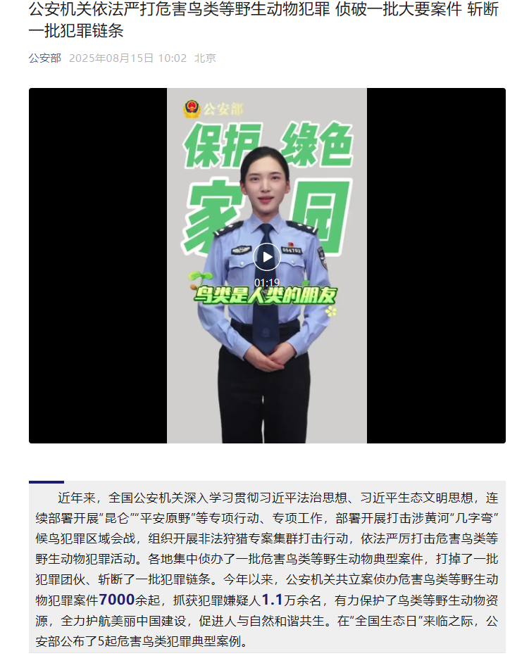 近年來,全國(guó)公安機(jī)關(guān)深入學(xué)習(xí)貫徹習(xí)近平法治思想、習(xí)近平生態(tài)文明思想,連續(xù)部署開展“昆侖”“平安原野”等專項(xiàng)行動(dòng)、專項(xiàng)工作,部署開展打擊涉黃河“幾字彎”候鳥犯罪區(qū)域會(huì)戰(zhàn),組織開展非法狩獵專案集群打擊行動(dòng),依法嚴(yán)厲打擊危害鳥類等野生動(dòng)物犯罪活動(dòng)。各地集中偵辦了一批危害鳥類等野生動(dòng)物典型案件,打掉了一批犯罪團(tuán)伙、斬?cái)嗔艘慌缸镦湕l。今年以來,公安機(jī)關(guān)共立案?jìng)赊k危害鳥類等野生動(dòng)物犯罪案件7000余起,抓獲犯罪嫌疑人1.1萬余名,有力保護(hù)了鳥類等野生動(dòng)物資源,全力護(hù)航美麗中國(guó)建設(shè),促進(jìn)人與自然和諧共生。在“全國(guó)生態(tài)日”來臨之際,公安部公布了5起危害鳥類犯罪典型案例。