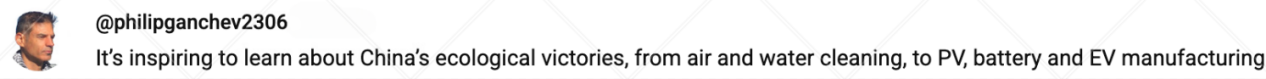 網(wǎng)友@philipganchev2306表示,“從空氣和水凈化到光伏、電池和電動汽車制造,了解中國在生態(tài)領域取得的成就令人鼓舞。”